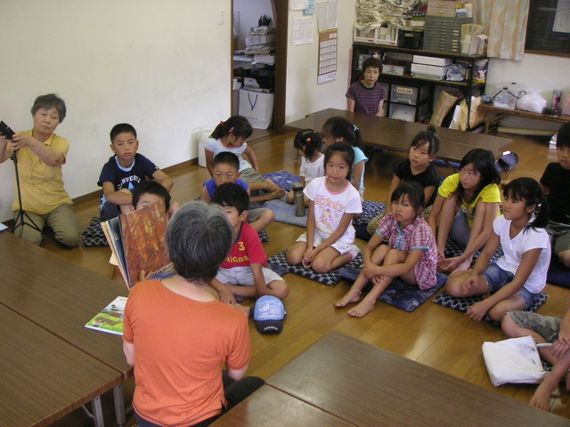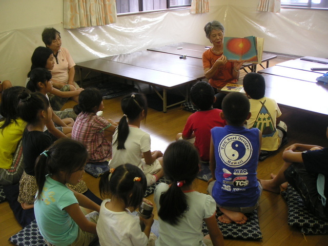 読み聞かせは 「まちんと」(もうちょっとの意味) 戦争の時に、被爆してのどが渇いた女の子に、ミニトマトをあげたら 「まちんと、まちんと」といって、もっと欲しがったので、トマトを探してきてあげるね!と約束して、その場を離れ、トマトを持って戻ったらもう亡くなっていた・・・。