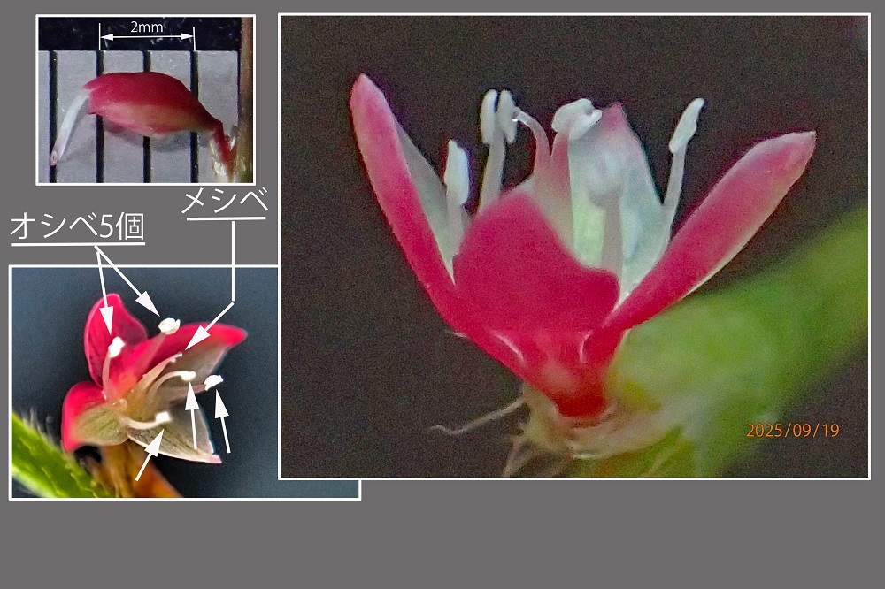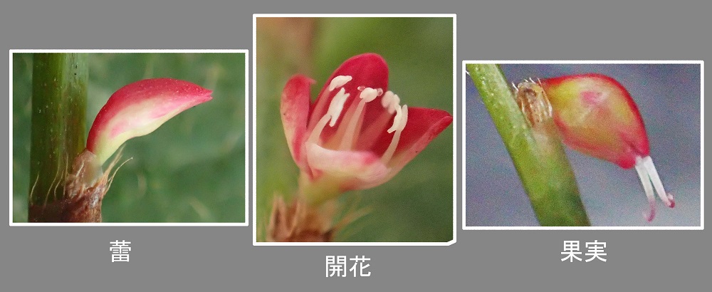 花径約2〜3o、花が咲き終わると萼片が閉じて蕾の形に戻る?がメシベが伸びるので蕾と果実の判別が出来る。