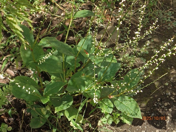 ミズヒキの白花品種で、庭先でミズヒキと競合している。ミズヒキの赤い萼片が白くなった以外はミズヒキと全く同じである?
