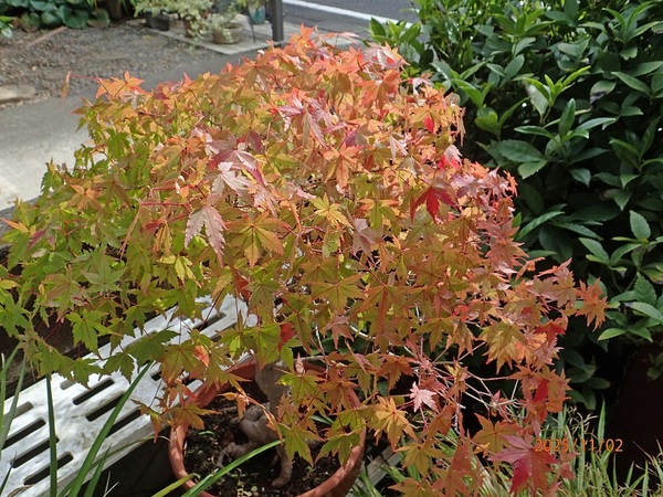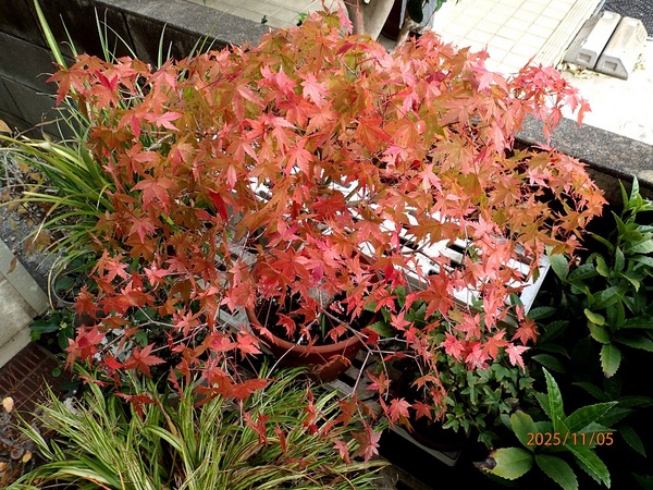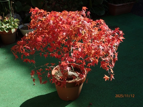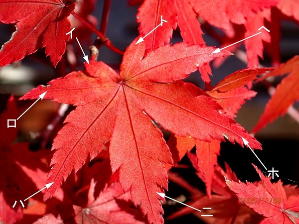 和名の由来は、葉に5〜7の裂片が有り此の裂片を「いろはにほへと」と数えた事に由来すると言う。鉢植えのモミジを眺めていたら約8日程で真っ赤に紅葉した。
