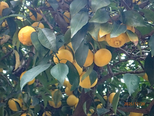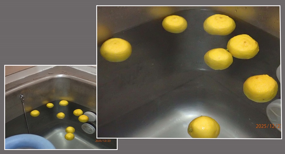 庭先の柚子小粒だが多数の実を付けた。冬至(12/22)に柚子湯に入ると風邪をひかないと言う諺が有るので、収穫して両隣にもプレゼント自宅で柚子湯に入った。風邪除けに成るかな?