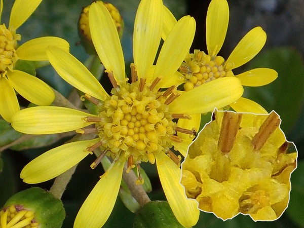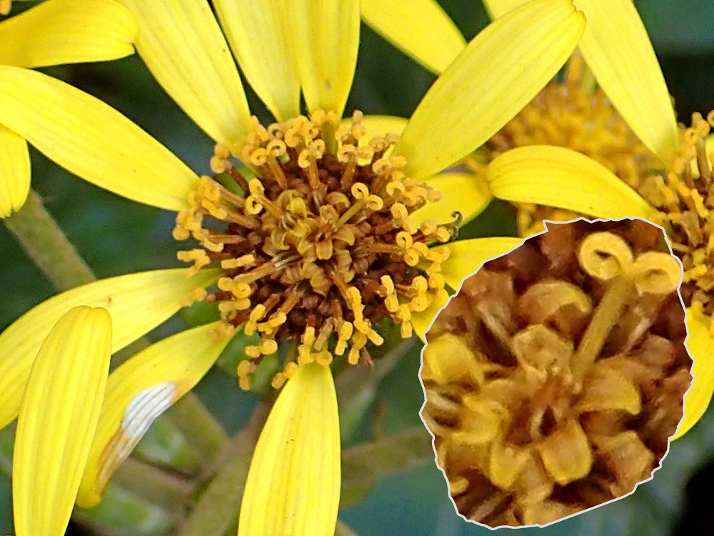 葉の形がフキに似ている事が和名の由来。花茎の上部で花柄を伸ばし花径5pほどの黄色い頭花を沢山付ける。頭花の定点観察?を続けたら2週間弱で筒状花が茶変し始めた。