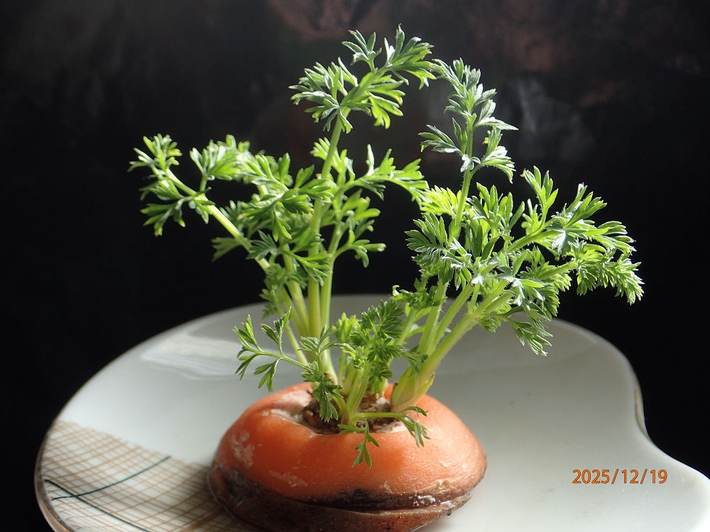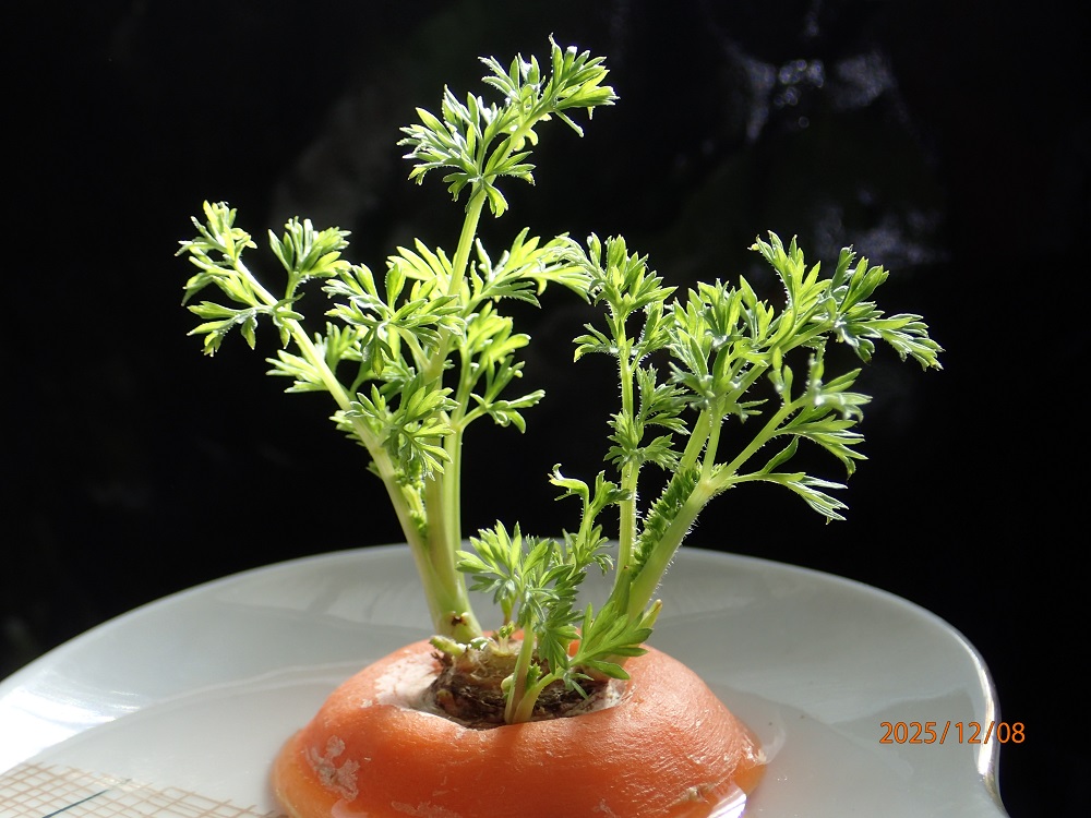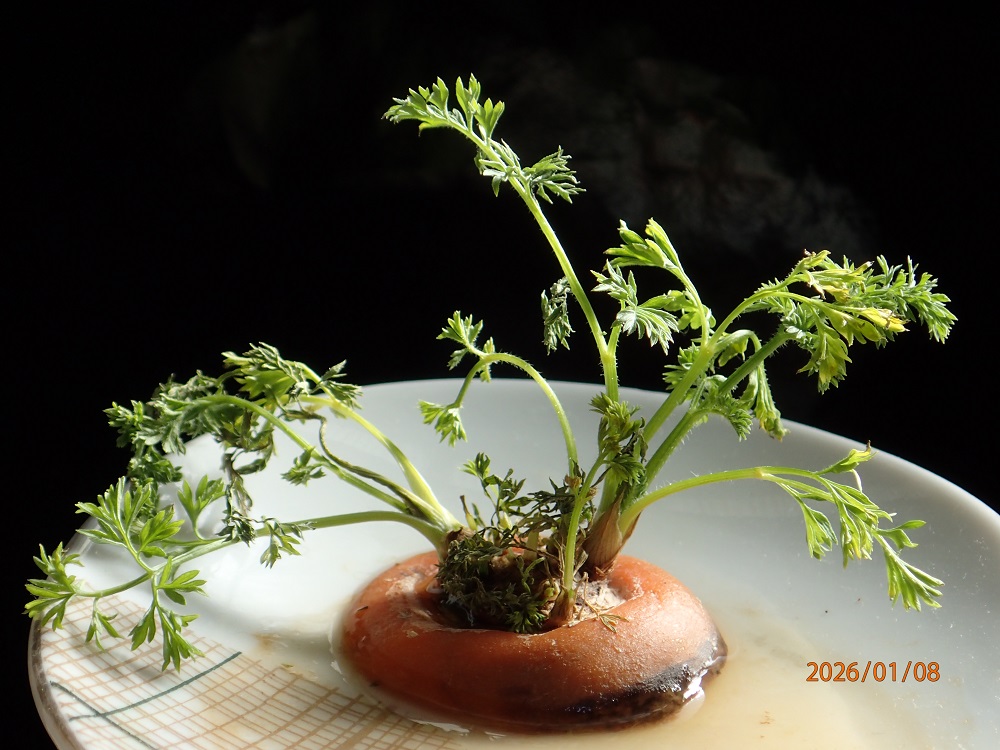 人参の「へた」水耕栽培すると、ネットには食用にも観葉植物としても楽しめると有った。観葉植物として約40日眺めた。茎や葉の生長は「へた」の下根の大きさに関係すると言う。サンプルの約10o位では能力不足らしい?