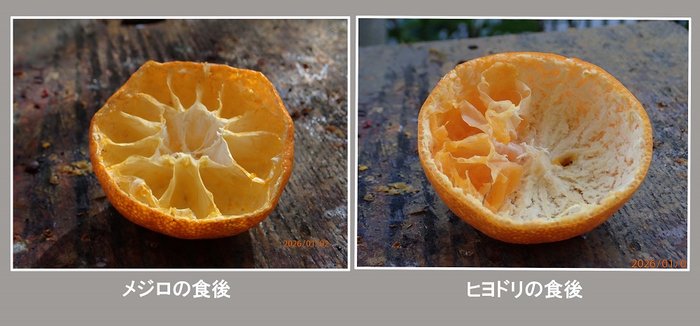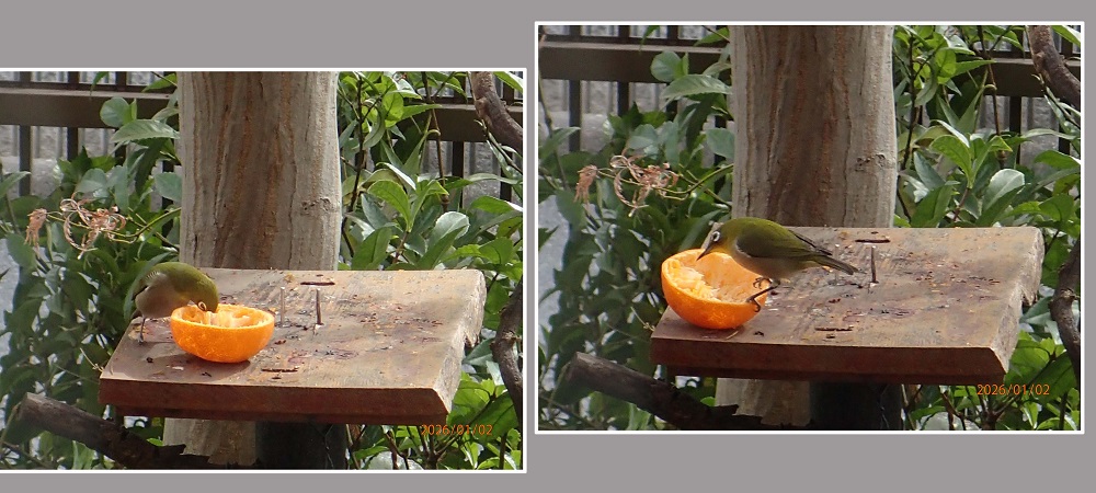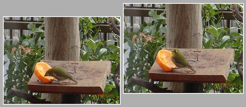 ヒヨドリの食べ残しを食べるメジロが哀れに思う。