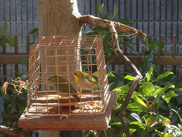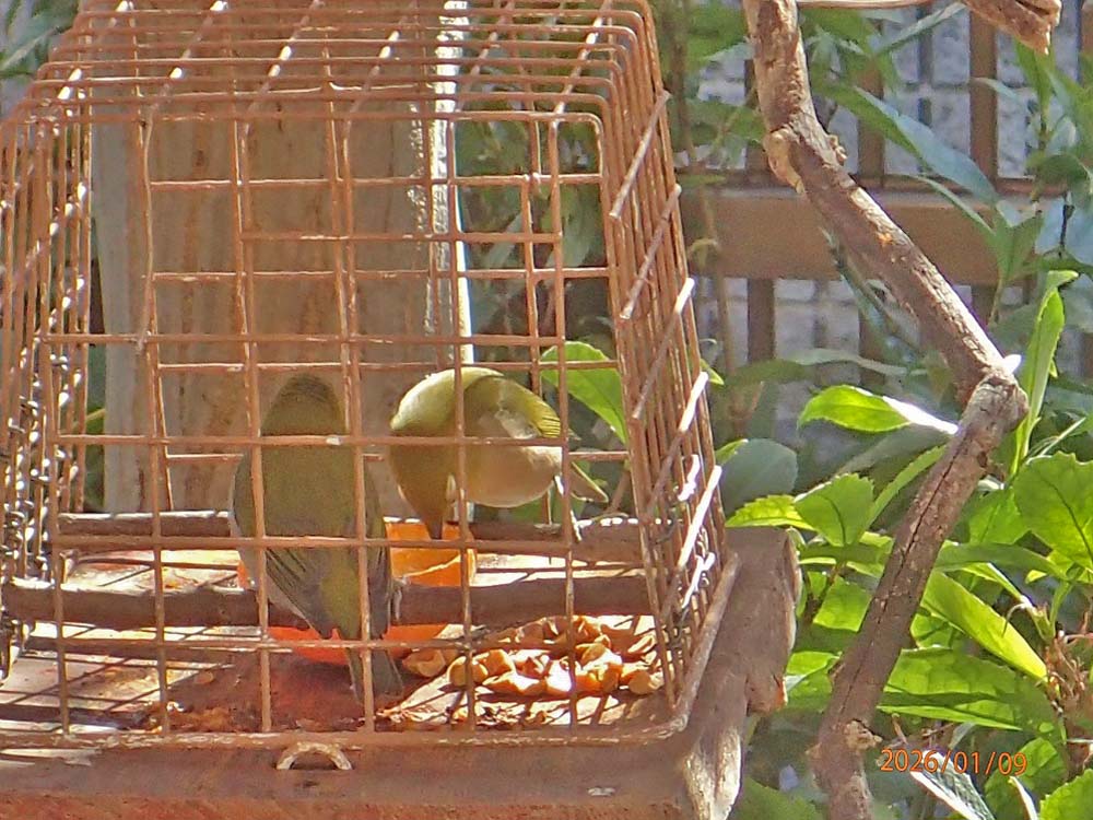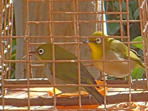 メジロは番いでやって来るが、今まで同時に食事しないが籠を置いたら二羽のメジロが同時にミカンを食べている???