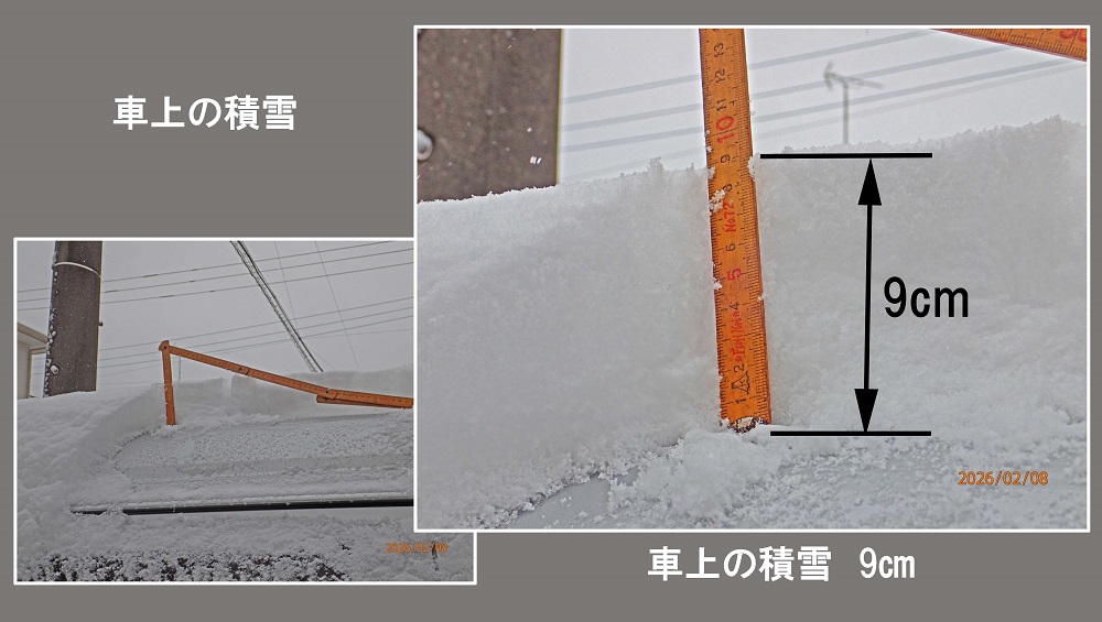 今冬初めての積雪。車上で約9Cm 車道で約5pの積雪が有った。