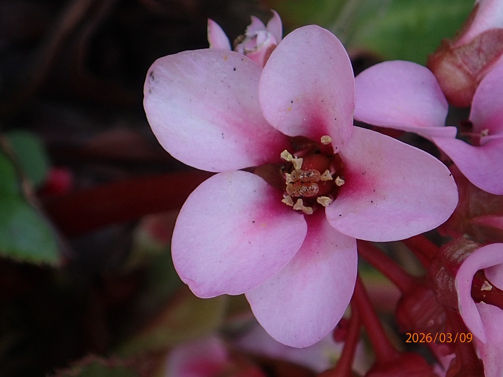 ヒマラヤ山脈周辺原産の常緑多年草。大きな楕円形の葉(約15p)に咲くピンクの小花(約2p)5〜6弁花がきれい。 撮影:3月9日、自宅庭先の露地。