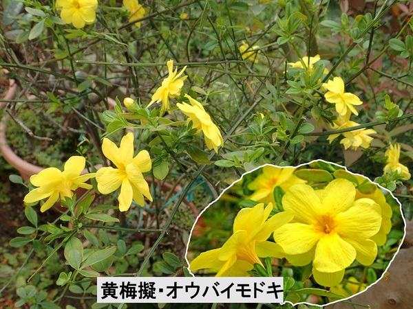 黄梅に良く似ているが、常緑樹で花冠は6〜8裂するか、二重〜八重咲。別名・雲南黄梅とも呼ばれ、黄梅よりも花が少し大きい。自宅の鉢植えで撮影。