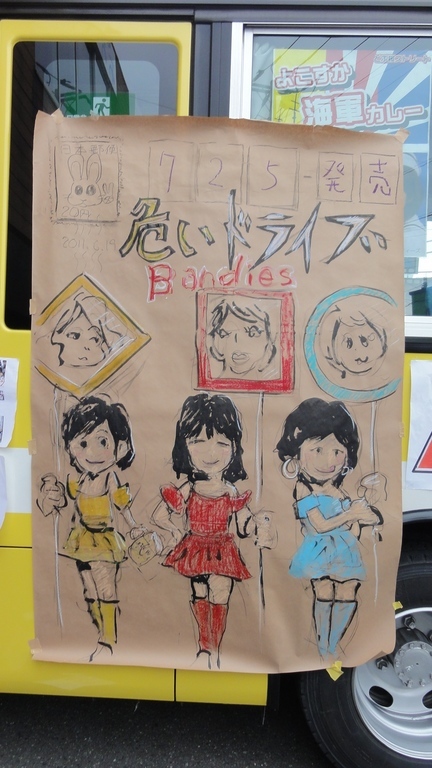 14:00から16:00 ライブバー エン 昼食とライブ スーパーバンディーズ号が、お店の前にある姿は圧巻ですね。 通りにも面していましたので、かなり注目されました。 飛び入り参会者もあり、 ライブ終了までに、美術部が巨大ハガキを完成してくれました。 ここでも、集合写真をパチリ! 京都から参加の、○○さんとはここでお別れです。