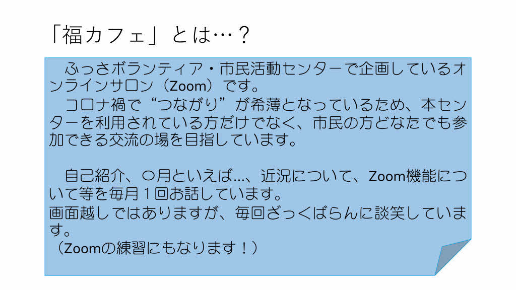 ※「福カフェ」とは…ふっさボランティア・市民活動センターで企画しているオンラインサロン(Zoom)です。