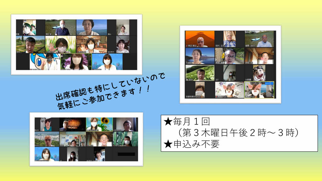 毎月1回、本センターへ登録している団体の方などとZoomで交流しながら、ざっくばらんに談笑しています。
