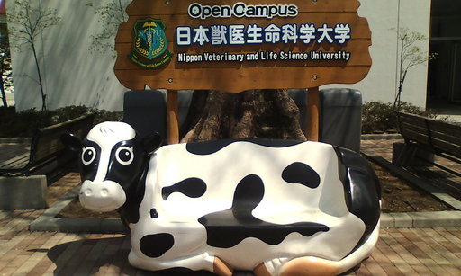 今日用事があって、日本獣医生命科学大学に行ったら、こんなベンチがありました。特に、ダックスフントの椅子は、かなり芸術的で、首振りました。