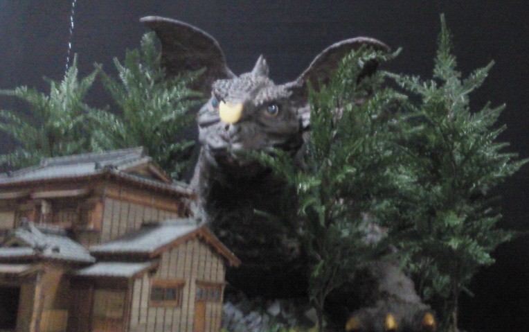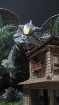 ジオラマが完成致しました。初めて造ったジオラマなので出来は良くありませんが、日本家屋の古い精巧な模型を購入し、前に置いて写真を撮りましたら、サイズもピッタリで、なんか良い感じになりました。私は怪獣には昭和の町並みが一番似合っていると思います。昭和の町並みが造れれば、映画のセットような大型のジオラマが造れるのですが・・・・・