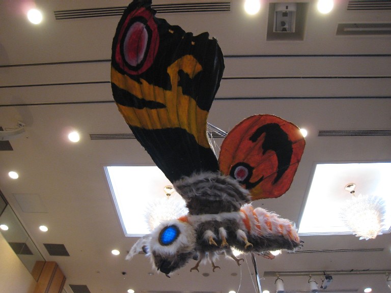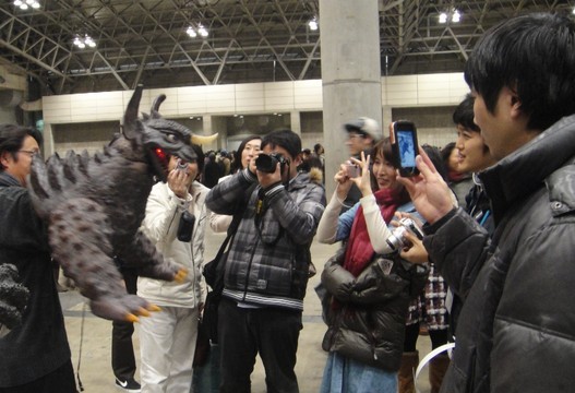 ギニョールを動かすと「スッゲー!」・火を噴くと「ウォー!」と盛上げて頂き、調子に乗って色々ギニョールを操演しました。今回モスラの成虫ギニョールが一番人気で、モスラの羽根を動かすとどこからともなく人が集まり「モスラ素敵!」・「触らせて下さい!」など女性に人気でした。