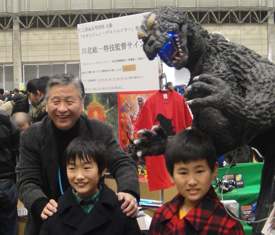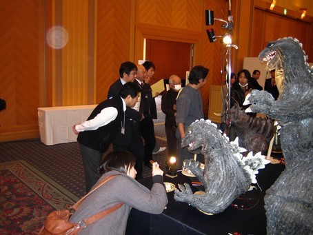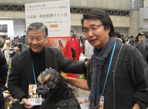 そんな中「川北特技監督」が突然私のブースのお見えになり、先日のパーティのお礼とゴジラの造形の話をさせて頂くと、監督が「サイン会にこのモスゴジ飾りたいな!」と言ってお帰りなりました。私は冗談だと思っておりましたが、再度監督がブースに見えて、私もサイン会場へお供する事になり、サイン会ではモスゴジを動かしてお手伝いさせて頂きました。