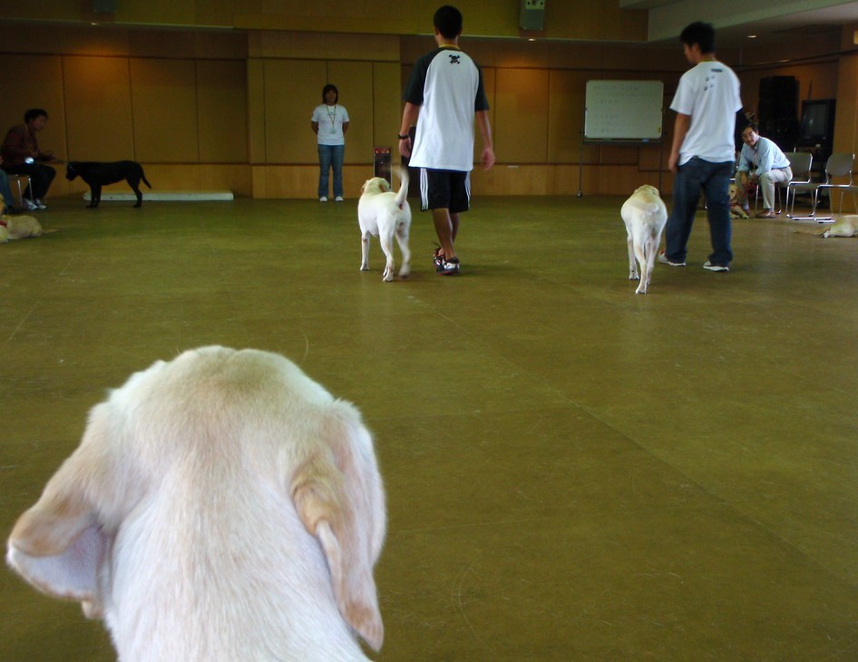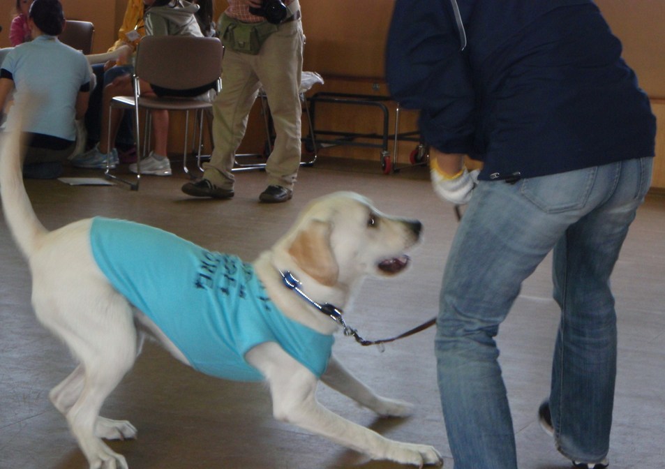 訓練士さんのお話をよく聞いて・・・盲導犬訓練士学校の学生さんと、遊びながら楽しくお勉強〜