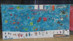 模造紙に巨大な絵を描き上げていきます。子どもたちを指導するのは、