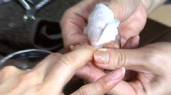 市販の器具もありますが、濡らしたガーゼなどで甘皮をゆっくりと押してあげるだけでも十分綺麗に