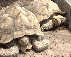 体長1メートル、体重90キロを超す超巨大カメ、ケヅメリクガメのグレートくん。なんと小さな子や、なっちゃんを背に乗せて歩いちゃっています。餌もむしゃむしゃと食べてくれて、ひとしきり興奮〜〜♪