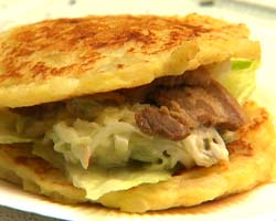 檜原産の美味しいジャガイモをつぶしてまとめたものを焼き、それをバンズとしたのだとか。間に野菜としっかり味つけした肉をはさみます☆