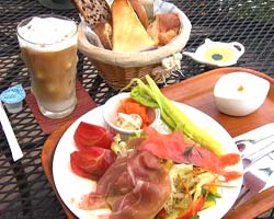 すると徒歩3分ほどで、こぢんまりとしたお洒落なクレープ屋さんが現れます。赤いテント屋根と銅版で創られた看板が目印です。