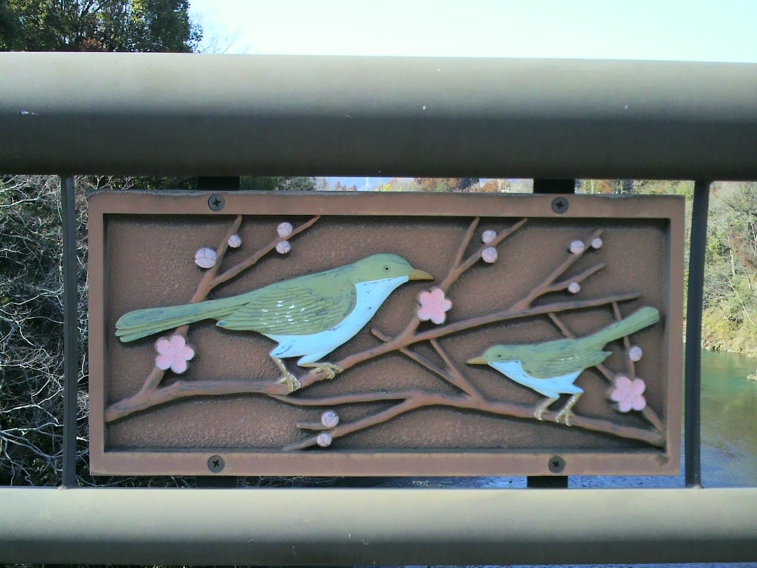 写真、上から近所の紅梅の咲き具合、和田橋欄干の鶯の彫刻?、2月23日の梅の公園(今はもう日陰を除き解けていると思いますが。)