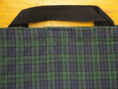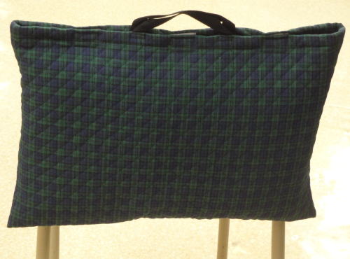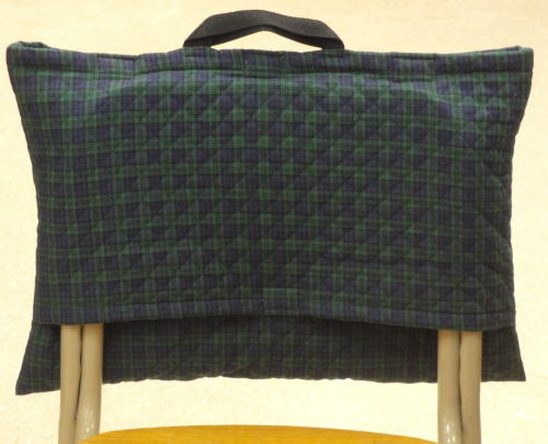 青っぽい緑色の格子柄・防災頭巾カバー。 |