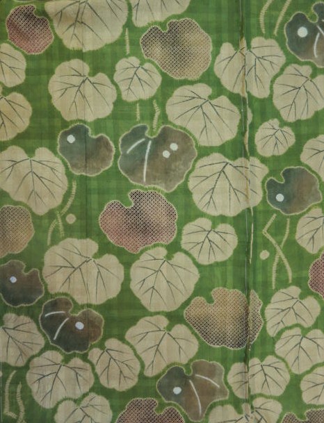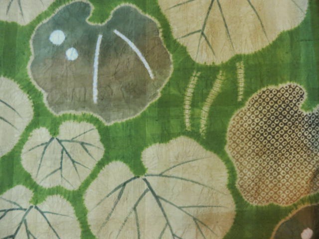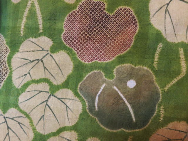 実際に床に広げてみれば、大作の風格のある作品だと実感します。地色が黄緑ということで、それだけでも個性的な雰囲気ですが、下染めされている生なり色と重なって、黄緑に凄味があります。絞りの大作ということで、技法にも興味がありますが、それ以前に、色だけで見る人を圧倒しますね。