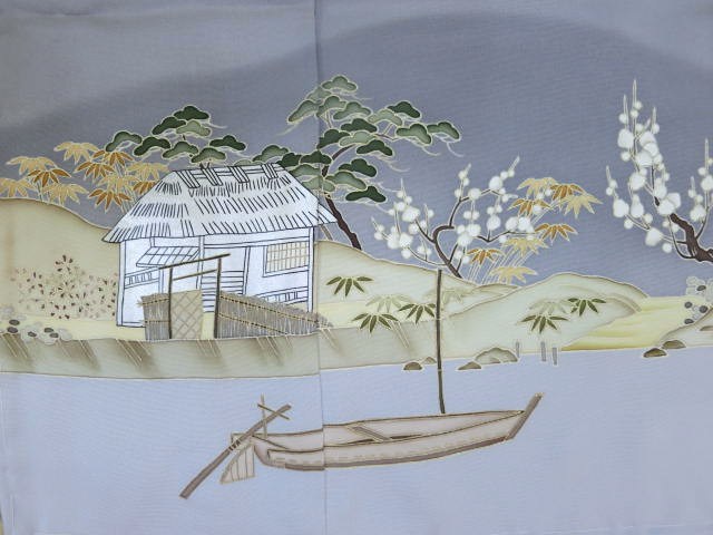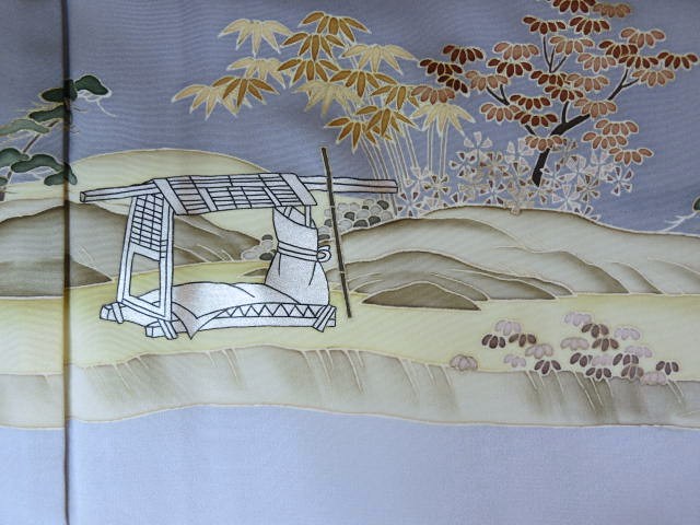 絞りを使った訪問着の大作です。絞りという技法を使って具象表現をした作品ですから「辻が花」とも言えますが、室町時代の辻が花にはない型疋田なども加えておりますし、全体の意匠も違いますから、現代的な創作作品というべきかと思います。「辻が花系」ぐらいには言っても良いかと思いますが。