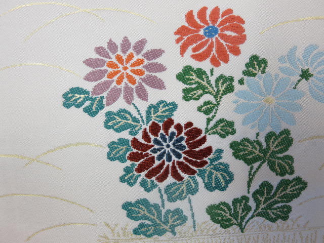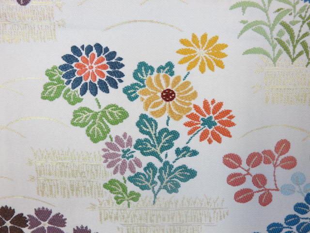 白地に琳派の秋草としておなじみのモチーフを並べた意匠です。モチーフ自体が魅力的とはいうものの、そのモチーフをほぼ等間隔に並べただけですし、色もきれいですが、織悦のレギュラーメンバーとも言うべき色たちで、特にひねりを加えたものでもありません。