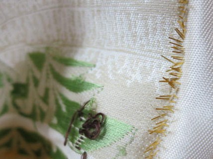 4番目の写真は、本金の平金糸で織られた芝垣部分の裏地の耳です。私は西陣の織物の価値を判断しなくてはいけないときは、手掛かりとして、とりあえず引き箔をチェックします。