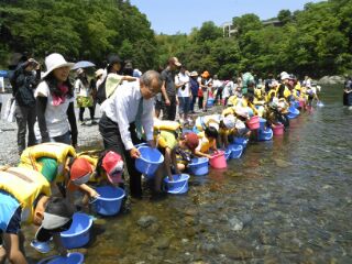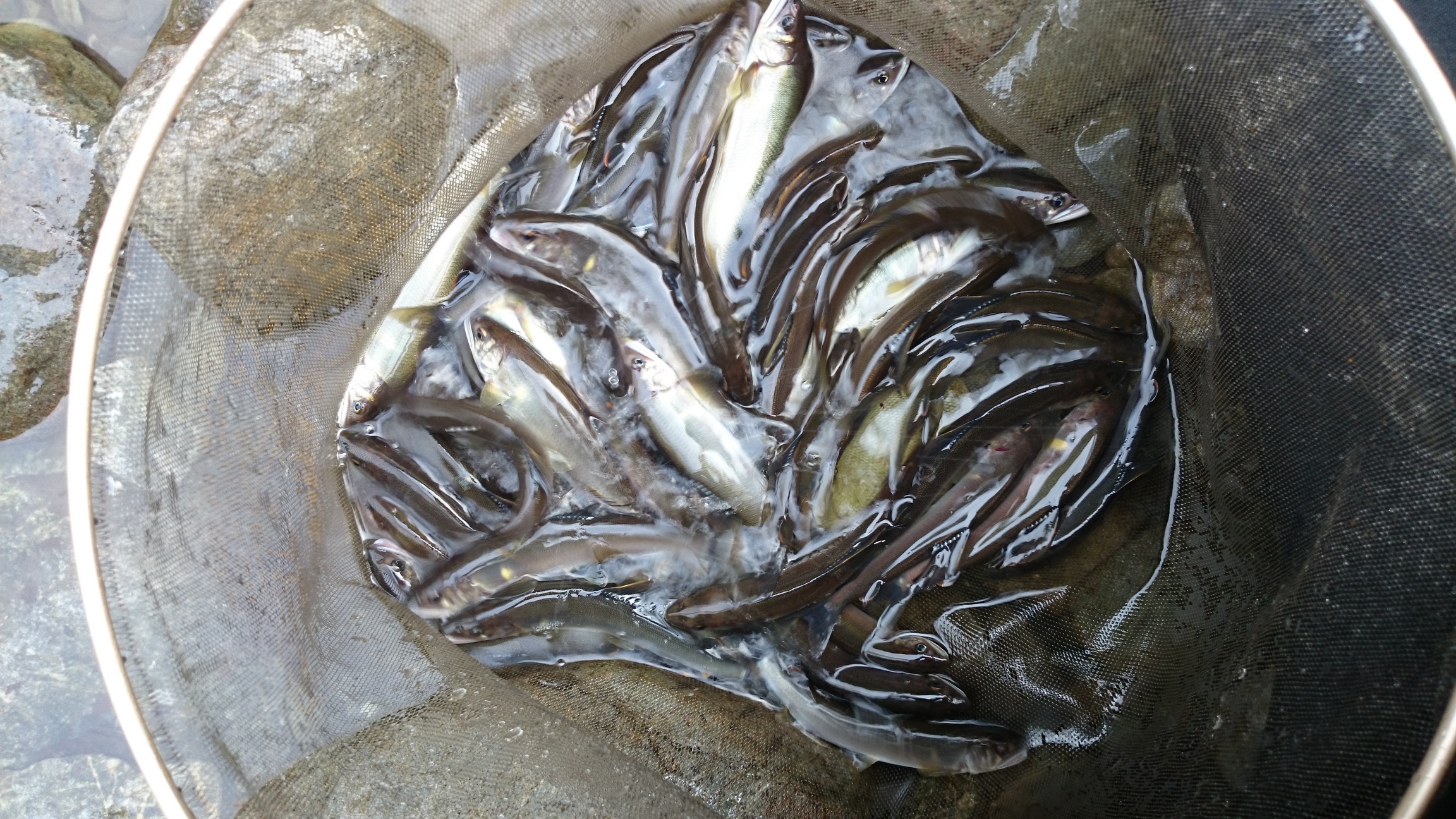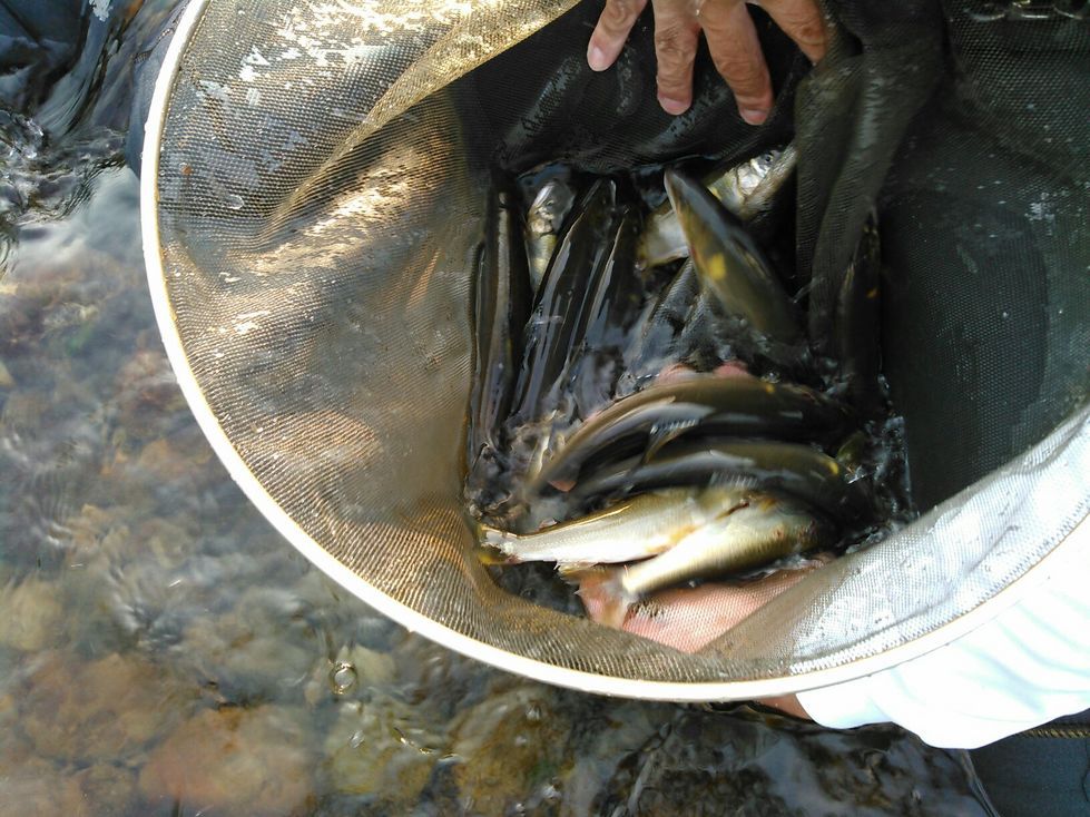 青梅に「おうめ水辺の学校」があるのを知ってますか? 市内の水辺に親しむ4団体とにより構成、青梅市環境政策課が事務局、 で活動しています。 毎年、5月から10月まで各団体が2〜3事業川に関する事業を行います。 今回行ったのは青梅水辺のフォーラムさんの事業で河辺川原で行われました。 マスのつかみ取り、ガサガサによる水辺の調査などを行いました。