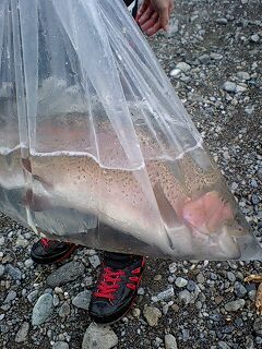 そして、下流からの天然アユの遡上が遡上期の大雨で羽村の堰を超えられたことも朗報でした。 東京都島しょセンターの標識鮎が御岳で数匹採捕されました。 通常の水量であると羽村堰の魚道に水が流れず、魚が上れません。