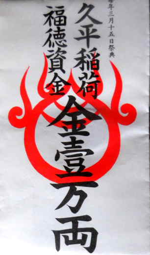 *名物「福徳資金」壹萬両を授かる。これを元手に仕事や生活に精を出し、翌年商売繁盛家内安全の報告ができれば倍返しの御礼をする。今日の福徳資金熨斗袋の中は百円硬貨。来年二百円の御礼をする。