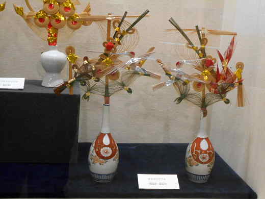 *ミキノクチは民具の一つで、正月飾りの縁起物として使われています。神棚に供える御神酒徳利にさして祀るもので、そこからミキノクチの名がついたと考えられています。材質・形など千差万別ですが、一般的には紙製・竹製のものを指すようです。発生時期は不明ですが、江戸時代まで遡れることは確かです。元々は農家の信仰民具でしたが、昔の供える感覚から、今は迎春の雰囲気を味わうといった感覚に移ってきたといわれています。平成4年6月1日「ミキノクチの製作技術」福生市無形民俗文化財に登録